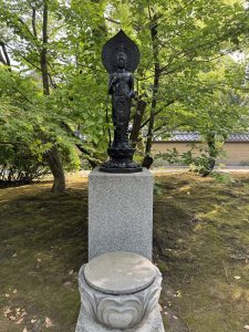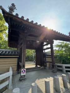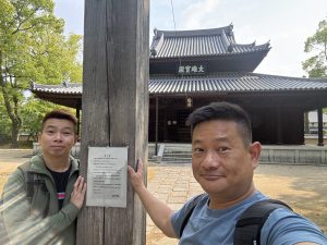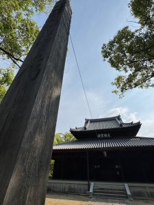 This large wooden building turns out to be the main temple in Shofukuji Temple. The main temple is also off-limits to visitors. There is a window through which we were able to see inside the temple. Three large golden statues of Buddha occupy the space inside the building. The interior of the building looked old but was very well-preserved. We spotted a string being tied to the hands of each of these Buddhas and did not think too much of it. Since there was nothing much we could do here, we left after paying our respects to the Buddha statues. As we turned around, we spotted a tall wooden pillar in front of the temple building, about 5m away. This is when my friend pointed out a string that runs from this pillar into the temple, which might mean this is how devotees connect to the Buddha statues inside. We headed back to the temple and noticed the string is indeed connected to the Buddhas inside. We headed out and prayed to the pillar, transmitting our wishes through the string to the Buddhas.