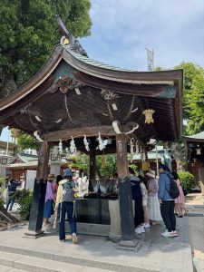 Our next stop, the Kushida Shrine, is about 7 minutes on foot from Tochoji Temple across the road. Compared to the previous two temples, this shrine is very crowded, mainly with passengers from our cruise ship. We entered the shrine through its side gate. Kushida Shrine is the spiritual centre of the residents of Fukuoka, and the locals believe the deities here protect and bless them. The main shrine features typical, elegant woodwork adorned with gold accents on the roof. In front of the roof was an ornament of hay, symbolising prosperity. Despite the crowd, everyone remained orderly as they offered their prayers to the deity installed in the main shrine.