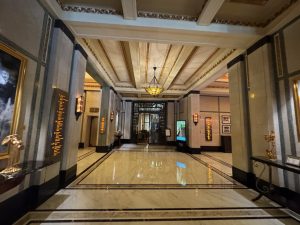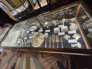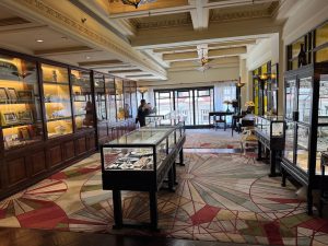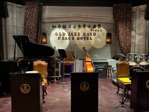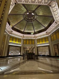 Fairmont Peace Hotel itself is an attraction on the Bund. Its green roof has been an icon on the Bund since the 1920s. Naturally, many significant events took place at the hotel. With such a rich history, the hotel offers complimentary scheduled historic tours of the hotel and its museum, conducted in both English and Chinese. Gordon organised a private historic tour of the hotel for us. We met up with our guide, Richard – the hotel’s historian, at the reception. Our tour began at the hotel’s museum, one floor above the reception. Richard took us through the exhibits in the small museum, from the famous persons who had stayed in the hotel and the suites they had occupied, to the silverware and menus crafted for specific events, to the important events and meetings hosted at Peace Hotel. Richard then brought our attention to a bill that was dated in the 1930s. Although the amount stated in the bill seems small compared to today’s standards, considering inflation and the cost of living at the time, Richard mentioned that the bill was easily equivalent to a year’s salary for a typical Shanghainese in the 1930s. Of the exhibits, the one that intrigued me the most was a small metallic disc. Richard pointed out this was a metallic vinyl record, which stored music played in the Jazz bar back in the days, and a memento for guests. I jokingly remarked that this was the predecessor of CDs.