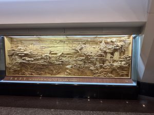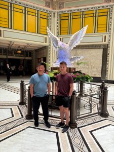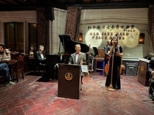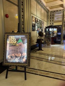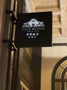 After the tour of the museum, we were brought to the octagon hall, where Richard directed our attention to the large dove sitting in the centre of the hall. This dove is made of 1,500 liuli (琉璃) crystal and weighs more than 1,000 kg to symbolise peace. We were drawn to the metallic murals hanging on the walls of the octagon hall, where Richard pointed out that they depicted the old times in Shanghai. Our tour continues through a hallway where a collection of movies and TV shows that were shot in the Peace Hotel. Our tour concludes at the small hall at the end of the corridor. Richard explained that this was the original main entrance of the hotel, but it had been closed permanently due to feng shui reasons. The significant structure in this original entrance was the split stairs, which are one of the original features since the hotel was built. We were shown a picture of Charlie Chaplin on the stairs.