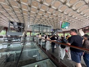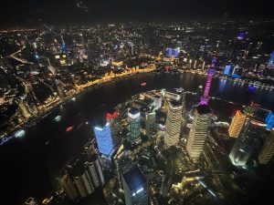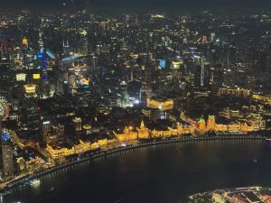 Several towers in the Pudong area offer a view of the Huangpu River and the Bund. On the one hand, I wanted to visit the Oriental Pearl Tower, as I had seen it for the first time 30 years ago. However, this shorter tower may not provide the best view of the Bund. The other tower is the taller Shanghai Tower, which features the highest observation deck in the country. The Shanghai Tower is approximately 632m tall, making it the third-tallest building in the world. Although it is not the tallest building in the world, the Shanghai Tower’s observation deck, at 546m, is higher than that of the Burj Khalifa in Dubai, at 452m. There are two prices for the entrance to the Shanghai Tower. RMB 180 only got us to the observation deck on level 118, while the more expensive RMB 268 ticket includes entrance to the light show on level 126. We bought the more expensive RMB 268 ticket, thinking we would be able to look out into the city at the tower’s highest vantage point. Our first stop was the observation deck at level 118, where a lift sped us up over 500m in under 3 minutes. The view from the observation deck on level 118 was stunning! The limits of Shanghai city seem to stretch beyond the horizon. From here, we were able to see the bend of the Huangpu River and the entire stretch of the Bund, as well as the Oriental Pearl Tower situated next to the river. The view of the city at night was especially beautiful. As we were walking around, we were telling ourselves, “This is just the beginning, the view on level 126 would be better”.