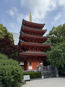 We can see our next stop right across the road from Shofukuji Temple. From the entrance of Shofukuji Temple, we can also see the five-storey pagoda. To enter the temple, we had to walk around the corner to the main road, where the temple’s entrance is located. Founded in 806 AD, Tochoji Temple is the oldest Shingon temple in Kyushu. The temple looked very well maintained, and its wooden main entrance is perhaps the oldest-looking structure here. The courtyard of the temple is a vast open space where we can see a pagoda, a large main prayer hall, and an octagonal pavilion. We were drawn to the bright red five-storey pagoda on the side. Topped with a golden spire, this pagoda is what one would typically associate with a Japanese pagoda. Like all pagodas in Japan, this pagoda is also closed to the public. Next to the pagado is a modest wooden building with its doors closed.