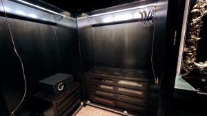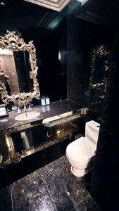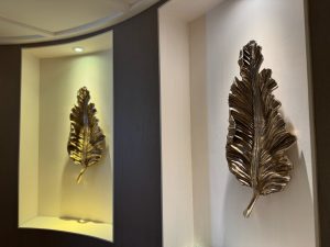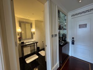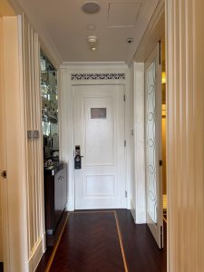 Behind the double-leaved main door lies a relatively large space dedicated to the entryway to the suite. Other than the two large gold-leaf art sculptures installed here, there are no other furnishings in the entryway, which makes it feel somewhat bare. The entrance to the powder room is also located at the entryway.