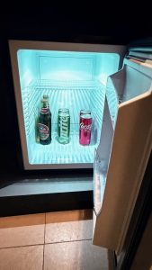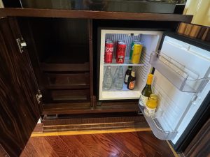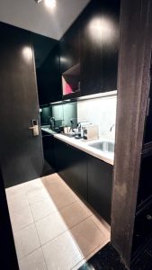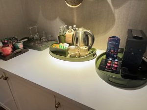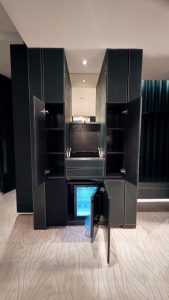 The Presidential Suite also features a small pantry equipped with two cabinets that run the entire length on either side. These cabinets provided us with more storage space. It is on one of these cabinets that a Nespresso machine and a kettle call home. Rather than a typical mini fridge, a mid-sized full fridge with a freezer, stocked with non-alcoholic beverages, was installed in the pantry. Mövenpick BDMS Wellness Resort treats its Presidential Suite guests to a one-time complimentary drink and snacks, which are available in the fridge and on the countertop, respectively.