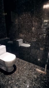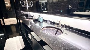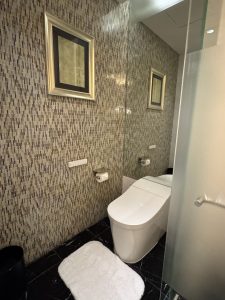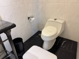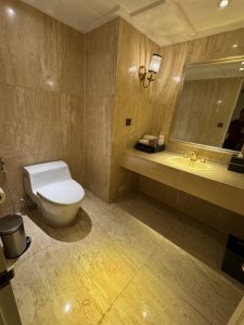 The bathroom lies beyond a doorless entrance and is decked with the typical yellow marble floorings typically found in most 5-star hotels. The bathroom felt narrow due to its design. Instead of having a huge space, the placement of the bathroom features centres around this corridor with the large jacuzzi bathtub at the end of the corridor. Due to the size of the jacuzzi tub, it took a considerable amount of time for us to fill it with water. The resort fitted two sinks in the bathroom, but due to the design, these sinks are placed apart from each other. With the amenities the resort placed on the countertop, I find little space left for us to place our toiletries here. The toilet and walk-in shower are housed in spacious cubicles opposite the sinks, located on the left side of the corridor. The toilet is positioned near the entrance of the bathroom, and the shower is closer to the bathtub. The walk-in shower has only a rain shower head installed, and the lack of a ledge makes it challenging to place our dental kits and facial washes. I also thought the lack of any hooks in the bathroom was one of its major design flaws.