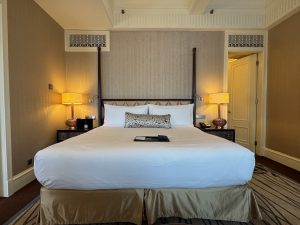 The space allocated to the bedroom in the Presidential Suite is also quite generous, about ⅔ the size of the living room. The ample space in the bedroom allowed the resort to furnish it with a sofa set, the first thing we came across after passing through the entrance to the bedroom. The sofa area in the bedroom is furnished with a grey fabric two-seater sofa and two single armchairs. Together with a glass top coffee table, facing the TV, the seating area gave us an alternate space to relax in and receive entertainment from the 55″ LED TV.