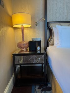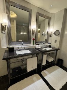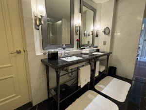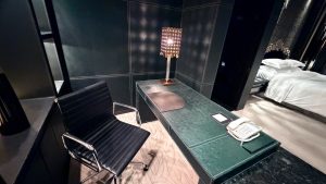 Next to the second seating area in the living room is a space carved out as the study of the suite. Surrounded by walls painted white, with a shelf of metallic and glass vases installed, the large work desk in the study provided a space for us to work. I like how the work desk is positioned to face the balconies opposite it, where we could occasionally look out into the greenery when our eyes grew tired of staring at the computer. The only flaw in the study is the placement of the two power outlets underneath the work desk, which can be quite a hassle to access for charging our laptops.