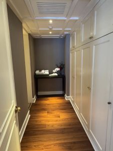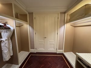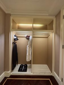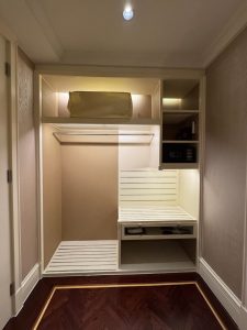The wardrobe in the Presidential Suite at Mövenpick BDMS Wellness Resort is located in a small room between the bedroom and the bathroom, creating a walk-in wardrobe effect. This part of the suite features two double-panel wardrobes and a single-panel wardrobe, providing ample space to store our clothes. Of these wardrobes, only one is fitted with a hanging rack. It is in this wardrobe that we found the in-room safe sitting on top of a two-tier cabinet. The other features are shelves and drawers that increase the number of items we can stow in the wardrobes. Like most hotels, the number of hangers provided by the resort was a bit few, but I am sure the resort will be happy to provide us with more if we request it. A small high table sits at the end of this room, where the resort places additional bath towels.
