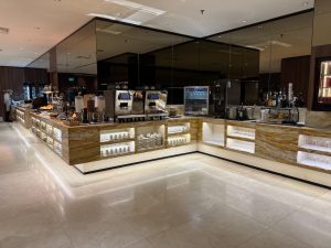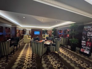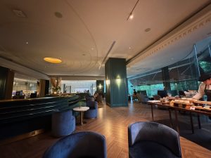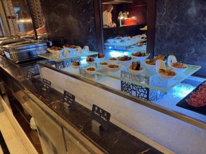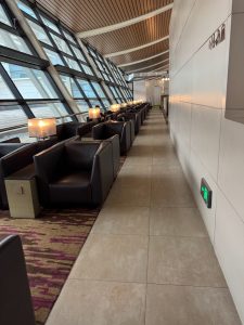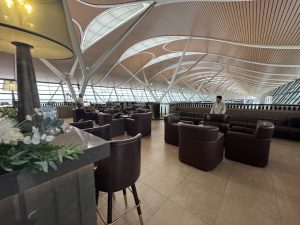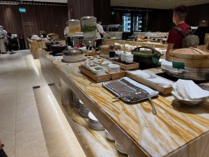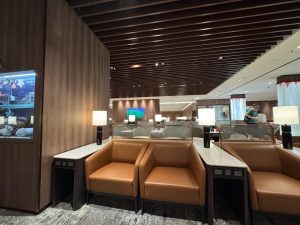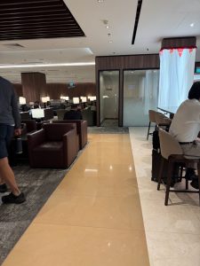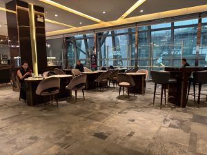 Asiana Airlines does not operate its Business Lounge in Shanghai Pudong International Airport. Instead of using the Star Alliance partner, D71 Air China Lounge, we were assigned to use the SkyTeam group partner, China Eastern Airlines D77 Business Class Lounge. I suppose this arrangement was intended to provide convenience for Asiana Airlines Business Class passengers, as the China Eastern Airlines Lounge was closer to our boarding gate. The China Eastern D77 Business Class Lounge, near Gate 77, is also accessible to Priority Pass holders. It serves many other airlines not affiliated with the SkyTeam group. Coming up from the escalator, the friendly lounge staff welcomed us to the lounge. China Eastern D77 Business Class Lounge felt airy and spacious as it shares the same ceiling as the airport terminal. The decor in the lounge mainly utilises natural wood that exudes a relaxing vibe. The front part of the lounge is primarily furnished with dining tables and chairs for four, which are also found near the bar area at the rear of the lounge. The seating in the centre of the lounge, next to the buffet lines, primarily consists of lounge armchairs that accommodate four or six people. Despite the armchair arrangement, we were also able to consume the food from the lounge comfortably in these seats. I also spotted a high table with power outlets for passengers to work on. While there are some individual high table pods on the adjacent side of the lounge, catering to passengers who prefer more privacy.