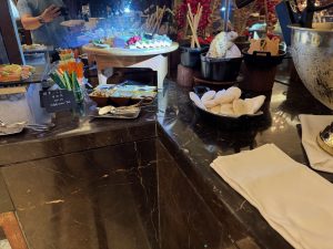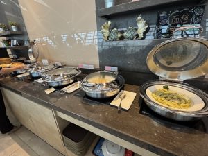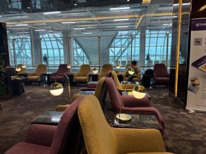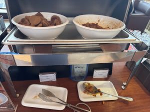 Bangkok Suvarnabhumi Airport is one of the few airports where Singapore Airlines operates its outstation SilverKris Lounge. The lounge is located diagonally opposite Gate D7, which is a stone’s throw from our departure gate of D6, making coming here an ideal choice while waiting for our boarding. The SilverKris Lounge in Bangkok Airport has a rectangular layout. Right past the entrance to the lounge, we spotted a small lounging area, decked with limited armchairs. Most of the SilverKris Lounge is decked with dining-style seating, occupying the space after the bar counter in the middle of the lounge and by the walls. There are some seating areas by the frosted floor-to-ceiling window, perfect for solo travellers or passengers who want to get some work done. Food is served in a buffet style at the SilverKris Lounge, tucked at the end of the lounge. Other than the Singaporean desserts and small finger food, most of the food available in this lounge features Thai cuisine. Compared to the Thai Airways Lounge, I thought the menu here was smaller with similar taste. SilverKris Lounge does not come fitted with any shower facilities, and even the toilet is a tad small. Due to the size and the layout, plus the number of passengers waiting here for our flight, the SilverKris Lounge felt busy.