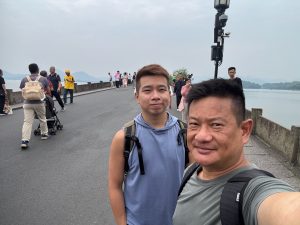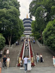 Our next stop was the Broken Bridge, about a 10-minute walk from the Baochu Pagoda. We had a brief rest at Starbucks on the southern part of the lake to escape the heat. The weather was rather humid when we did the climb to Baochu Pagoda. After resting briefly, we walked across the road to the Broken Bridge. The Broke Bridge was essentially a series of three sandbars connected by bridges. This place was given the name “Broken Bridge” as these bridges connecting the three sandbars appear to be broken when viewed from a distance during winter due to the snow. The Broken Bridge was the setting in the Chinese folklore “Legend of the White Snake” (白蛇传), centred around the romance between a man and a White Snake Spirit. Walking on the sandbars of the Broken Bridge brought us close to the West Lake; it felt like walking on the lake itself. We could see Baochu Pagoda sitting atop the hill we were on moments ago, as though she was flexing her beauty on the shores of the lake from the Broken Bridge. Locals taking their leisurely walk along the bridge, boats pulling off from the sandbar, paddling on the lake, and occasionally some locals feeding the ducks on the lake are common sights along the sandbar. Walking on the Broken Bridge was mostly relaxing, but we had to avoid the many tourist trams along the way. As our next stop, Leifeng Pagoda, was a distance away from the Broken Bridge, we initially wanted to take the tourist tram (costs RMB 80 per person). We managed to find one where the seats facing the back were empty. Unfortunately, the driver was on his way for his lunch break. We continued our walk towards the end of the sandbar, looking out for the next tram with the last row empty. Soon, we found ourselves at the end of the sandbar. We spotted some buses making a U-turn. We approached a lady who appeared to be a staff member, and she recommended that we take one of these buses to Leifeng Pagoda, which costs only RMB 2 per person.