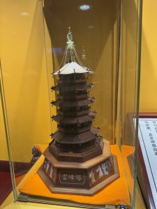 The bus ride to Leifeng Pagoda took only 10 mins, saving us time and a lot of walking. To get to Leifeng Pagoda from the Broken Bridge, we rode the bus for eight stops and alighted at Sutinankou (苏提南口). While the Baochu Pagoda was often described as the beauty of West Lake, in contrast, the bulky appearance of the Leifeng Pagoda was often associated with a monk. The entrance to Leifeng Pagoda costs RMB 40 per person. We visited the basement level first, followed by heading to the ground floor and taking a lift up to the top floor of the pagoda, and slowly making our way down the pagoda. The basement of the Leifeng Pagoda exhibits its original structure. Leifeng Pagoda was originally built in 977 AD as a monument to house the hair of Buddha. The pagoda collapsed due to excessive brick theft and nearby construction work. The pagoda we see today was rebuilt and reopened in 2002. Leifeng Pagoda is also the setting of the story in “Legend of the White Snake”, where the white snake spirit was trapped under the pagoda for years until her son released her. From the original structure on display in the basement, I wonder if the locals linked the collapse of the pagoda to the efforts of the white snake’s son in saving his mother. In addition to the original structures, the basement also features the original bricks and some Buddhist relics.