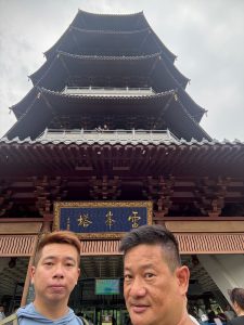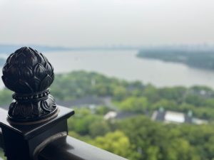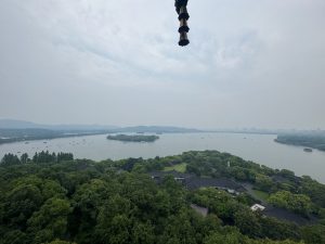 We headed to the ground floor to take one of the lifts to the top of the pagoda. The lift only stops at level 5 of the 7-storey pagoda; visitors must walk up the remaining two levels. As we emerged from the lift on level 5, we were captivated by the golden underdome of the level, but didn’t spend time looking at it. Our goal is to go to the top of the pagoda. At the top of Leifeng Pagoda, we were treated with an unobstructed view of the West Lake. This offers a far better view of the lake compared to the hills where the Baochu Pagoda is located. From here, we can see the Baochu Pagoda, seemingly emerging from the ground like a needle being stuck, as well as the numerous bridges on West Lake and the islets within the lake. Most of the visitors on this level focus on the view of the lake, and we found fewer crowds at the side facing the hills behind the pagoda. Although not as scenic, the hills stretching to the horizon evoke a certain tranquil vibe. It is a pity that today was a hazy day.