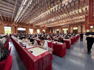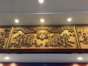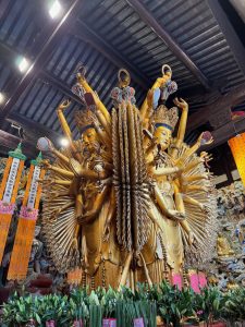 After visiting and offering our prayers in the four main halls, we spent the rest of our time at Longhua Temple retracing our footsteps back to the entrance and visiting the side prayer halls. A hall beside the Three Sages Hall had the statue of Thousand Hands Guanyin (千手观音) installed. Instead of having only one statue, there are three statues of the Thousand Hands Guanyin with their backs against each other, which seems to represent seeing all from all directions. In addition to the Guanyin statue, this hall is also adorned with carvings of Bodhisattvas and Gods cast on the walls of the hall. The other hall that I like is the Arhat Hall (罗汉堂). In the centre of the hall is a dark brown wooden statue of Guanyin, with her lifelike merciful appearance. There are an impressive 500 smaller arhats on the walls surrounding the Guanyin statue in the centre. The two side halls between the first and second main hall are the Drum and Bell Towers, where statues of Guangong (关公) and Earth Store Bodhisattva (地藏王菩萨) are installed respectively. After paying respects to all the Buddha and Bodhisattva statues in the prayer halls, we wandered around the grounds of Longhua Temple. We found a huge hall filled with people quietly sitting in rows copying Buddhist sculptures. Copying these sculptures is a Buddhist practice that trains one’s patience and a calm mind. It was a spectacular sight to see so many people sitting quietly in a large hall doing their things calmly. Leaving Longhua Temple after spending 1½ hours here praying and walking around, we headed for lunch in one of the shopping malls nearby.