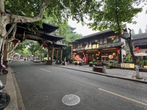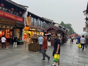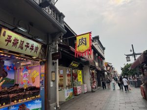 We tried to cover every street on Hefang Street and found ourselves in front of an ancient gate building with the Chinese words “Drum Tower” (鼓楼) inscribed on it. This tower was used to mark time and announce important events in the past. Today, visitors can only walk under the Drum Tower to a street filled with restaurants and eateries. We traced our footsteps back to Hefang Street and came to the Southern Song Imperial Street. Compared to Hefang Street, the Southern Song Imperial Street sees less foot traffic and feels more peaceful. This street is shorter than Hefang Street, with mainly art galleries.
