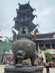 We headed back to the ground level of the temple and found a 3.8m Burmese white jade Buddha statue in a room along the Drum Tower side of the temple. The Buddha statue exudes a compassionate expression. At first glance, one would think that the robe on the jade Buddha was made of cloth, but this is actually part of the jade used for the statue. There is another hall opposite the Jade Buddha statue, where we find a 6.2m tall statue of Guanyin (the Goddess of Mercy), made from a 1000-year-old camphor wood. The lower level of the former entrance has another statue of Guanyin, installed in front of the now-closed entrance. We spent the rest of our time here at Jing’an Temple, exploring the many rooms open to the public, and discovered a prayer room with three Buddha statues located at the back of the temple. As this is a secluded part of the temple, we were the only ones here offering our prayers to the Buddha statues. Before leaving the temple, we spent some time tossing coins into the large furnace in the middle of the courtyard.