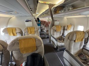 The colour theme used on the larger Asiana Airlines aircraft is also found in this narrow-body aircraft. The A321-200 Business Class cabin had a bright and airy feel, with a royal vibe. The seats in the cabin are upholstered in beige, and the headrest covers and pillows are adorned with yellow, a symbol of royalty and nobility in the Korean culture. The cabin was bright, thanks to the use of white lights, which gave it an airy feel. The Business Class cabin is equipped with only three rows of two seats in a 2-2 configuration.
