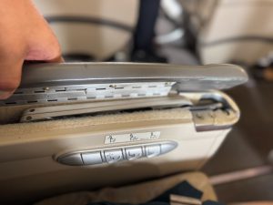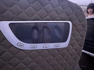 Asiana Airlines A321-200 Business Class seats have a seat pitch of 40″ and are 22″ wide. As this is a recliner seat, it does not come in flatbed mode but is capable of reclining up to 5″. The seat controls consist of three mechanical levers that control the deployment of the calf rest, the extension of the calf rest, and the seat back recline. When the seat is reclined and the calf rest is being deployed, the seat feels comfortable enough for me to doze off in it, thanks to its thick cushioning. However, due to ageing, I found difficulty in activating some of the seat functions with these seat controls.