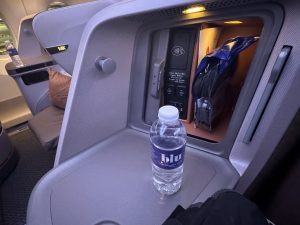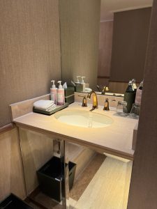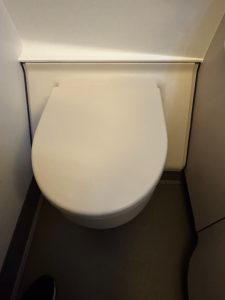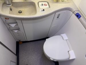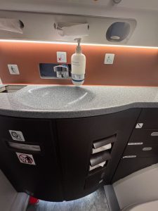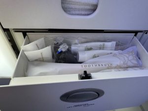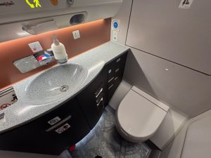 There is only one lavatory behind the cockpit serving all 12 Business Class passengers. As this is a smaller plane, the lavatory felt a little cramped compared to the airlines’ wider-body aircraft. However, it has the necessities of a lavatory. The lavatory does not come across as posh or any different from that in Economy Class. Still, I noticed additional amenities, such as dental kits and mouthwash, in addition to the L’Occitane lotion and facial mist, which were made available in the Business Class lavatories.