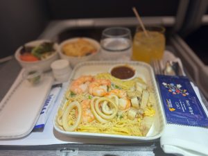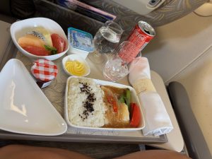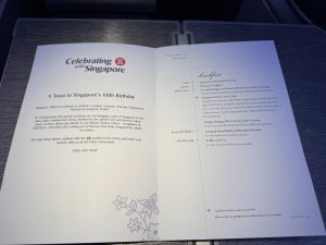 Singapore Airlines offers a “Book-the-Cook” service for its Business Class passengers on flights operating out of Singapore and selected airports, allowing passengers to select meal choices that are not part of the regular menu served onboard. However, the “Book-the-Cook” menu offered to us appears to be a watered-down version, with only six choices, perhaps due to the time of the flight and the flight time. I opted for the Singapore Nasi Lemak from the “Book-the-Cook” menu. The cabin crew confirmed our food choice before departure, and we were promptly served once the seatbelt sign was turned off. The coconut-flavoured rice was fragrant, and the sambal chilli was flavourful. However, I find the fried chicken a little on the dry side. As part of celebrating Singapore’s 60th Birthday, Singapore Airlines included one Singaporean dish in its regular menu. In addition to the Scrambled Eggs and Indonesian Beef Fried Noodles, we also found Singapore Fried Carrot Cake on the regular menu.