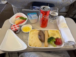 For the short 2-hour flight today, Asiana Airlines provides Business Class passengers with full meals. The two main course options for our flight today are Braised Dory fish and Egg Crepe. I had the Egg Crepe, served with fresh-cut fruits and a yoghurt. The scrambled eggs had a slightly flaky texture, but the ham was well-seasoned, and the sausage was not overly dry. My friend opted for the Dory fish, which tasted a little bland. Overall, I thought the meal served on this flight was quite hearty for breakfast.