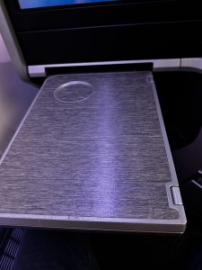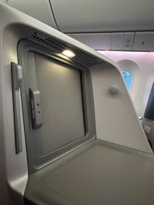 The Business Class seat table onboard Singapore Airlines A350-900 medium-haul variant is stored under the personal TV and can be released with a push of a lever. The bi-fold design of the seat table meant I did not have to fully deploy the table when I just wanted to use it to place small items. When fully deployed, the seat table is sizeable for one to work on their laptop. In addition to this seat table, the airline also designed a side table by the cabinet, which provided me with additional space to place my belongings. Singapore Airlines’ A350-900 medium-haul Business Class seats are equipped with one power outlet and two USB-A outlets inside the side cabinet for passengers to charge their electronic devices. In addition to the overhead reading lights, the seats are equipped with side lights located inside the seat shell, catering to all three modes of the seat setting.