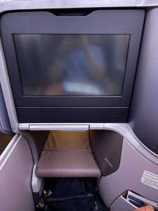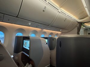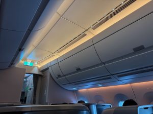 Singapore Airlines’ B787-10 has one single Business Class cabin housing all 36 seats. This arrangement made the cabin look busy and cramped. However, the colour choice for the Business Class cabin onboard their B787-10 aircraft gave it a relaxing and elegant vibe. Using earthy tones in their seats and interior seat shell, and dark blue carpet, this colour theme resonates with the main colour theme of Singapore Airlines. The white walls and cream seat shell gave the cabin a clean look.