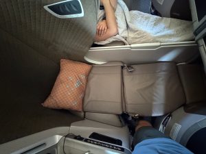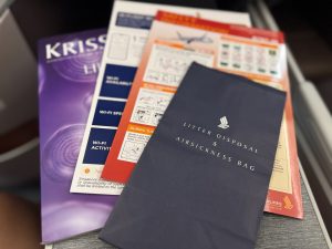 Singapore Airlines B787-10 Business Class seats are fitted with an 18.1″ touchscreen personal TV. The picture quality of the TV was sharp, and the colours were vibrant. A tilt-down feature has been incorporated into the screen’s design, allowing passengers to watch TV while in the flat bed mode of the seat without compromising picture quality. The IFE controller features a pseudo-smartphone design, where movie selections are made via the responsive touchscreen on the controller. Singapore Airlines provides its Business Class passengers with noise-cancelling headphones that are very effective in blocking out ambient noises. In fact, the noise-cancelling function was so effective that I had to remove my headphones when communicating with the cabin crew. KrisWorld, Singapore Airlines’ in-flight entertainment system, offers an extensive library of entertainment options, including movies, TV series, games, and destination guides. I had no issues finding something to keep me entertained from the huge menu of Hollywood and international movies for this short flight. I like how KrisWorld has this function that allows me to save the movies I’m watching to my KrisFlyer account, where I can log in and continue from where I left off. Singapore Airlines also provides complimentary in-flight wifi to all Business Class passengers. However, the speed only allows us to browse social media and does not support streaming videos from YouTube.