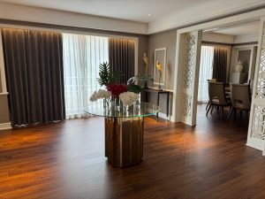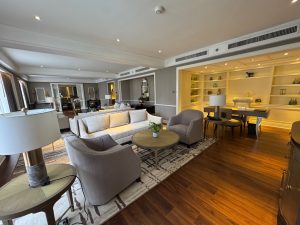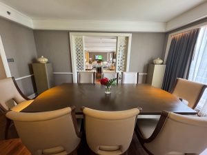 The biggest area in the Presidential Suite at Mövenpick BDMS Wellness Resort is dedicated to the living room. The living room features not one, but two seating areas, positioned side by side. The moment we entered the living room from the entryway, a feature glass table topped with pots of arranged fresh flowers welcomed us. I thought these fresh flowers and the living plants dotted around the Presidential Suite gave guests a welcoming sense. The entryway is not situated in the centre of the parquet flooring living room; rather, it is designed on the side of the living room. The seating area near the entryway features a three-seater couch and two accompanying two-seater sofas, accompanied by a large coffee table. This first seating area is positioned to face the dining room and is a great place for the suite’s occupants to host their friends.
