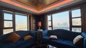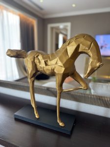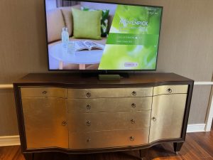 An elongated glass-top table, ornate with horse artworks, formed a separation between the two seating areas. The second seating area is placed to face the entrance to the bedroom. Decked with another three-seater sofa as a centrepiece and two single-seat armchairs, this seating area seems to suggest its dedication to being an entertainment area. The second sofa area is placed to face the” 55” flatscreen TV placed on a gold-painted wooden TV console, meant for occupants of the suite to enjoy entertainment from the numerous local and international channels on the TV screen. Apart from serving as a placeholder for the TV, I found the TV console to be very functional, with ample storage space for us to put away our shopping. The entire living room is tastefully designed, featuring a good blend of earthy elements and a luxurious vibe.