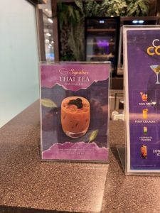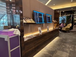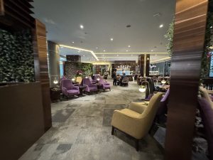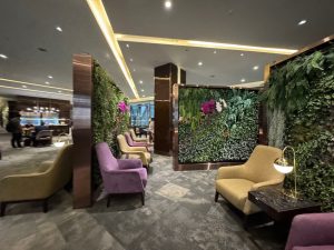 As we used the Fast Track lane near the Thai Airways Business Class check-in counter in Row A, the Thai Airways Royal Orchid Lounge in Concourse D is accessible via an escalator from the immigration counters. There are two lounges at the reception; we were directed to the refurbished lounge on the right of the reception. Passing through the entrance of the lounge, a bar counter welcomed passengers to the lounge. Behind the bar is the main lounge, where we saw several green walls installed in the seating area. The lounge still bears the signature colours of Thai Airways, decked in purple and yellow armchairs with dark brown. These green walls are a refreshing touch to the otherwise old, dark, and gloomy Thai Airways lounge that I used to visit. The main lounge is furnished with armchairs for passengers to relax and enjoy a quiet time.