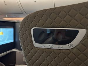 Singapore Airlines mainly deploys its B787-10 aircraft for regional routes, featuring its regional Business Class seats. Singapore Airlines was one of the first few airlines to offer lie-flat seats for regional routes. The Business Class seats on Singapore Airlines B787-10 are arranged in a 1-2-1 configuration, giving passengers direct aisle access. The high shell-back design ensures a certain amount of privacy for its Business Class passengers, especially in flatbed mode. Each Singapore Airlines regional Business Class seat has a pitch of 60” and measures 28” wide, and is capable of reclining 180°, turning it into a true flatbed. These seats are very comfortable to sit on due to their thick cushion padding and soft leather. Singapore Airlines’ regional Business Class seat comes with three standard positions: upright for take-off and landings, flatbed for passengers to catch a snooze, and the in-between position (I called this the lounge mode), which is somewhere between the upright and flatbed mode that offers passengers an angled position for better comfort during cruising. These seat modes can be adjusted via the preset seat controls located under the side table. Out of the three seat modes, I find the lounge mode to be the most comfortable, as I was able to configure the recline angle according to my preference.