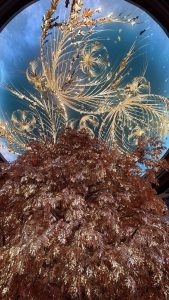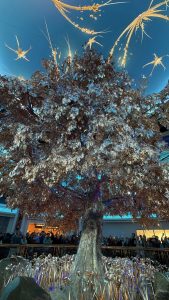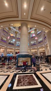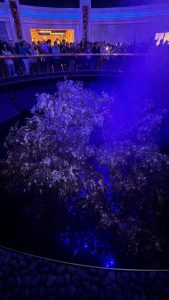 The artpiece on the table between the king bed and the seating area in the bedroom of the Presidential Suite