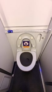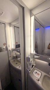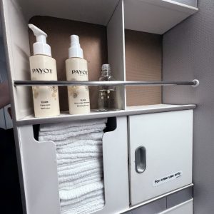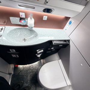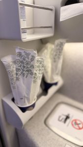 There are a total of five lavatories for all 301 Economy Class passengers, two in the front of the Economy Class cabin, two at the back of the cabin and one between the two sections of Economy Class. The white lighting, used in conjunction with the large mirrors, made these lavatories feel larger than they actually are. I like the footpaddle design of the trash bin cover, which makes it easier to use and more hygienic. I reckon more airlines should adopt this design. A single small bottle of Singapore Airlines-branded hand lotion sits on the small rack at the sink with dental kits underneath, alongside the hand wash. Singapore Airlines is one of the few airlines in the world to provide its Economy Class passengers with dental kits.