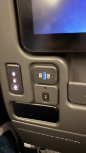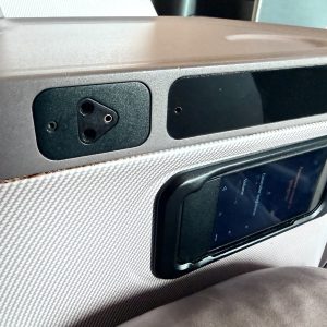 There is an international power socket between the seats on board Singapore Airlines B787-10 Economy Class