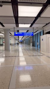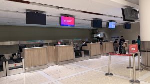 The row of check-in counters in Hong Kong International Airport Sky Pier Terminal