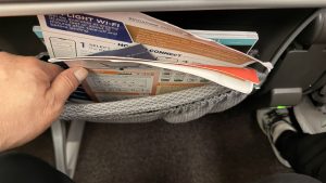 Seats onboard Singapore Airlines’ B787-10 are arranged in a 3-3-3 configuration with a 32″ seat pitch and a width of 17″. These Economy Class seats are capable of reclining up to 5″, giving us a way to feel relaxed on these seats. The Economy Class seats are pretty comfortable, well-padded, and offer good legroom. I had lots of space between my knees and the seat in front of me. Storage is always an issue in Economy Class seats. Due to the limited space allotted to each passenger, Economy Class passengers often have only the seat pocket in front of them for storage. Singapore Airlines increases storage space in its seat pockets through design. On top of the large compartment, Singapore Airlines also included two smaller pockets in front of the larger seat pocket, perfect for storing smaller items. There is also a somewhat useless pocket underneath the personal TV, which can only be used to stow very small items such as the provided earplugs, AirPods or charging wires.