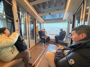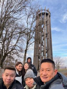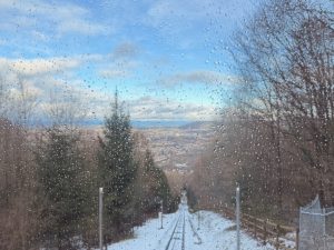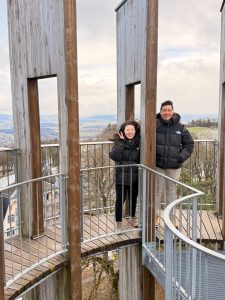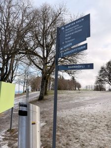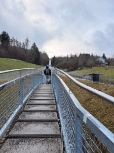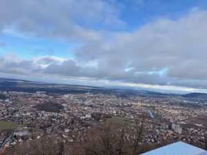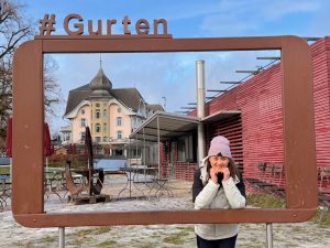 As the Gurtenbahn climbed up the hill, we saw more of the City of Bern. We were sure we would get a panoramic view of the city. Soon, we found ourselves on top of Gurten Kulm. Exiting the station, we came to a crossroad and a map of the attractions on Guten Kulm. There is a hotel, a restaurant and even a miniature train ride up here. Attracted by a Tower structure, Gurten Aussichtsturm, we made our way to the tower. Entry to the metallic 25m Gurten Aussichtsturm was free. A 121-step spiral staircase in the core of the open tower took us 5 mins to climb up. As we were climbing up the Gurten Aussichtsturm, the cold wind made climbing the tower difficult. But that does not deter us from reaching the observation deck at 22m of the tower. From here, we were treated to a panoramic view of Bern. The city of Bern suddenly looked small, but the view was great! We could see the River Aare that snakes around the Altstadt and even the mountains behind Bern. The only issue we had was the occasional strong winter wind that blows on the tower, shaking the tower so much that we felt it could topple anytime (it is perfectly safe), or we could be blown away by the wind. Despite the cold wind, we enjoyed the view the Gurten Aussichtsturm offers and were glad we made it up the tower. After spending 10 minutes up here taking pictures and soaking in the panoramic view of the city, we decided to head down the tower. However, with the constant wind blowing, we had to wait for the wind to turn weaker (so it wouldn’t shake the tower so much) to descend the tower.