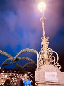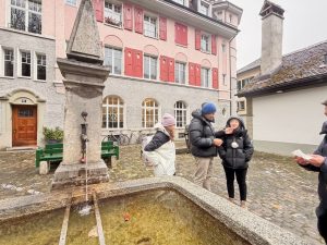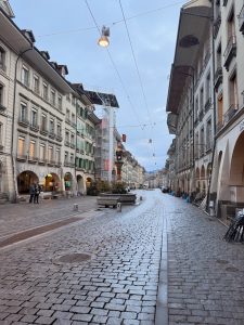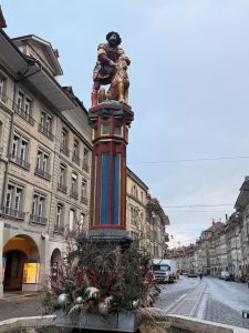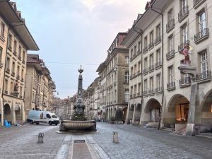 After visiting the Zytglogge, we walked along the street away from the main street towards the bridge that connects the old town to the bear park. We spotted the Zähringerbrunnen a few steps from Zytglogge. The Zähringerbrunnen is a monument honouring the city’s founder, depicting a standing bear with a shield and flag and a bear cub standing between its legs. As we walked further down the street of Kramgrasse, heading to our next stop of Münsterplatform, we were immersed in the medieval buildings that stood the test of time. These buildings, now being converted to shops, have a pseudo cellar opening in front, which seems to lead underground (we later got to know that these are actually basement access, as some businesses used this space to set up shop). However, most of the shops we saw were still closed as we were pretty early. As we walked past the post office, we urged our friend to buy a postcard and mail it there to prevent her fate three years ago, when she did not receive any of the postcards she sent from our Italian trip. We told her that by passing her postcards directly to the post office staff, she would definitely receive her postcards.