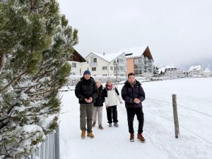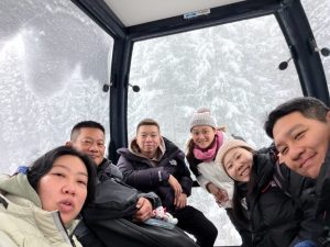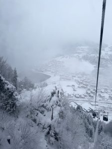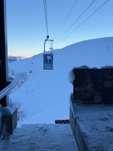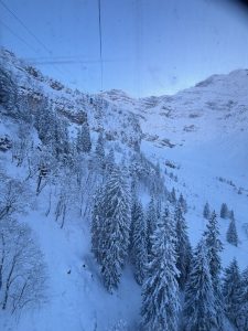 After spending an hour sledging, we had some time before our train ride back to Interlaken. At this point, I suggested to my friends that we take a walk to the frozen lake that the local lady told us about earlier. The walk was relatively easy, mostly on flat ground. We followed the path on the higher grounds, occasionally littered with signs that pointed out where we were. We were expecting to see a sign that pointed to “Lake Trübsee” later on the road. We saw people skiing at a distance and a ski lift operating, and occasionally a structure or two popping out along the path covered in thick snow. The Rotair that we were on this morning was constantly in our sight, assuring us the peak of Mt. Titlis was still with us. Walking on the snow with the towering mountains felt like hiking in Antarctica, but with more people around. We were not worried about getting lost, as long as we still saw people walking our way and there were still signs around that pointed the direction. Halfway on our walk, we came across a sign that said “Trübsee 🚠 – 35mins; Untertrübsee 🚠 – 20 mins”. This is when I opened up Google Maps and realised that we were walking on the perimeter of Lake Trübsee, and the area on the lower elevation is the lake. However, there was no way we could reach the lake surface. Seeing the sign, I thought that since the Untertrübsee cable car station takes a shorter time to reach, it must be closer to us. We followed the sign and headed towards Untertrübsee station. As we were walking on the path, which turned from a flat surface to a gradient. This is when we saw the poles that we were following lined up to the top of a hill, and my friends remarked, “Do we have to go all the way up?” At this point, we were already 10 minutes into the walk, which meant we just had to walk another 10 minutes to reach the cable car station. We persisted and made our climb up a small hill. The climb technically wasn’t difficult, but the thick snow and the high altitude (at 1,900m asl) made it challenging for us. We finally reached the top of the hill, and the path went downwards from here. It took us 10 minutes to climb up the hill, and we did not see any signs since the crossroads 10 minutes ago, plus there were no cable car stations around. We suspected we might be on the wrong path, after all, if there is a cable car station, the structure would be large and would be full of people. After a 5-minute walk, I saw a cableway at a distance and a blue box coming up the mountain attached to it. I announced to my friends the direction to the cable car station. Most of them did not see it initially, but as we got closer, they eventually did. We finally reached the Untertrübsee cable car station, which is just a small hut, and we were the only ones here. This cable car station was automated. The cable car was small, despite stating a maximum capacity of eight, and with the six of us, we already felt the tightness. The cable car ride started with a glide over the forested mountains filled with pine trees, but the real fun comes after the last pylon in the forest, where the cable car drops down some 500 m over the cliff surface. We can’t help but admire the ingenuity of the Swiss cable car engineering.