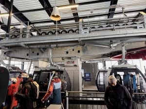 Once at the valley station, we redeemed a cable car ticket from the counter staff using our Tell Pass. Passing through a walkway towards the cable car ridge, we were met with hordes of skiers going up the mountain. There are so many people that there were four queues forming, and the escalators stopped working. Despite the crowd, we got to our first cable car in under 10 minutes. The first cable car is an eight-seater cable car that brought us up to 2,428m, through Trübsee and terminated at the Stand. As most of the skiers came in large groups, we got the whole cable car to ourselves. After the initial climb, the cable car inclines gradually above a pine tree forest. At Trübsee, as the cable car was pulling into the station, a local and her son hopped into our cable car. She was very friendly and recommended that we check out the frozen lake at Trübsee if we have the time later (we followed her recommendation, which led us to our little adventure hiking in the snow). The ride up to Stand took around 20 mins. At Stand, we followed the signs posted around that said “Titlis” and got the rotating cable car – The Rotair. This is one of the reasons that pulled us to visit Mt. Titlis, apart from the higher mountain peak, this mountain also features the world’s first rotating cable car. This ride took another 5 mins to reach the top. As the Rotair ascend another 1,000m up into the mountain, the cabin gently rotates without much motion being felt. It is this rotation that would give us a 360° view of the Swiss Alps without us having to move around inside the cabin. Having said that, it is a pity that the floor-to-ceiling glass of the cabin was covered in snow and had some heavy scratches, which prevented us from getting any views on our way up. Nonetheless, it was interesting to have ridden the world’s first (and only) rotating cable car.