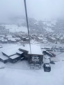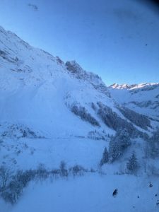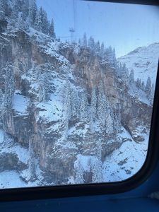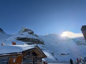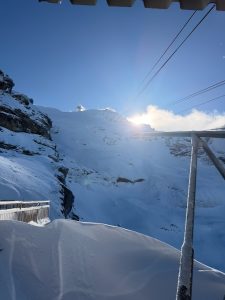 We headed down to the cafe for a light meal and some coffee, and also to find out where the entrance to the Cliff Walk is. The cafe staff informed us that the Cliff Walk was closed due to a snowstorm last night. After eating, the clouds seemed to dissipate, and we were able to see the grandeur of the Swiss Alps.