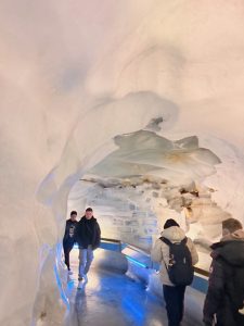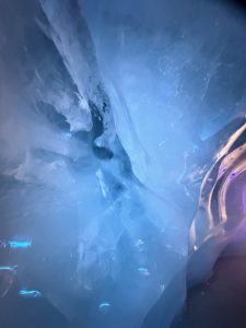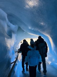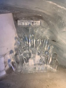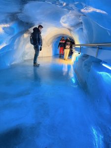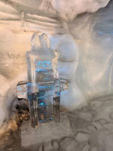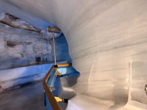 The only thing to do up here, other than going out to the panorama terrace, is to visit the Titlis Glacier Cave, on the third floor of the building. Passing through the entrance, the Titlis Glacier Cave, formed 5,000 years ago, is an ice tunnel about 10m under the glacier on top of the mountain. Though we were in an icy cave, the floor did not feel slippery. Inside the cave, we saw the thick ice formation on the ceiling and the walls. Other than the ice tunnel, there are displays of things such as cowbells, wooden cows and even a bottle of Gin being frozen inside blocks of clear ice. On top of these frozen things, there are some ice sculptures, such as the Titlis Logo and a robot. The biggest ice sculpture was an ice chair. Other than that, I thought the Glacier Cave was quite boring. We spent less than 10 mins inside, with most of the time used to take pictures.