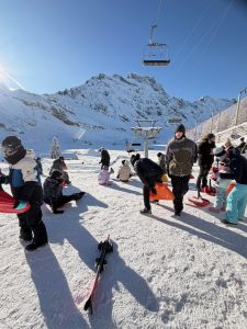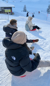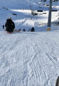 There is a snow fun park at Trübsee, where we can do some sledging. The signs to the snow fun park were not very well marked, but we found it eventually. Titlis placed some plastic sledges at the exit of the tunnel to the park, where visitors can help themselves to this equipment at no charge. We first used the “beginner” type, which is essentially flat pieces of plastic. We tried sledging in Innsbruck last year when we were in Austria, and are quite excited to introduce our friends to this activity. Unlike the slopes in Austria, the slope here is longer. As we sledge down the slope, the slope starts with a steeper gradient and eventually tapers off to a flat surface. The initial drop was exciting and certainly generated more speed. As our feet were on the snowy surface, we generated a lot of snow backsplashes that affected our sight. But that does not affect us having fun sledging. My first-timer friends like the adrenaline rush from the sledge, and we ended up spending one hour having fun sledging. In between, we encouraged our friends to try the “more advanced” sledge, the upright ones. They were initially sceptical but eventually got used to it.