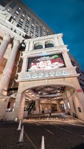Sofitel Macau at Ponte 16 is located on the Eastern part of the main Macau Peninsula, on the banks of the Pearl River Delta, facing the Chinese city of Zhuhai. The hotel is about 30 minutes from the Hong Kong-Zhuhai-Macao Bridge Immigration Building and 1 hour from Macau International Airport. Sofitel Macau at Ponte 16 is situated in the historic district of Macau and is conveniently located near the city centre, where sights such as Senado Square and the Ruins of St. Paul are within 7 minutes on foot. Sights located on the other islands of Macau can be accessed by bus from the bus stop directly in front of the hotel, which links to other parts of Macau, such as Taipa, Cotai, and Coloane. There are numerous local restaurants within a 5-minute walk from the hotel, where we were able to find food. The hotel is also conveniently located near 24-hour convenience stores and a supermarket.
