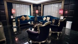 The first seating area in the Presidential Suite features a three-seater couch and a couple of two-seater couches