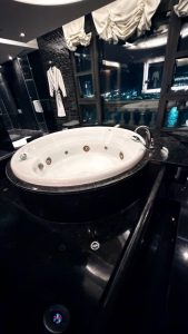 The bathroom is fitted with an oversized jacuzzi tub that takes forever to fill up