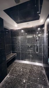 The walk-in shower in the bathroom has only a rainfall shower head with very good water pressure