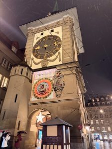 We witnessed the hourly puppet show on the astronomical face of the Zytglogge at night