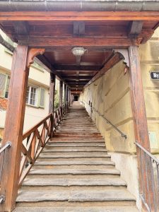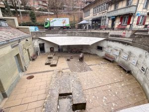 Exiting the lift, we spotted a booth with a lady sitting inside, collecting the CHF1.50 for the use of the lift. As my friends were looking for small change for the use of the lift, I checked with the friendly lady if the cost of using the Mattelift was covered under the Bern Welcome card. We were pleasantly surprised that it is covered. Bidding farewell to the friendly lady, we walked towards the River Aare, just mere minutes away from the Mattelift. We saw a bridge that we could get closer to the River Aare next to the artificial channel that was constructed in 1360 to divert the river water into one of the three watermills. However, upon reaching the structure, we found that it was closed to the public, meaning we were not able to get closer to the River Aare. We headed back to the main streets of Matterquartier and headed to the Bear Park. The Mattequartier is medieval Bern’s smallest neighbourhood, mainly housing workshops and mercantile activities. Walking in this peaceful neighbourhood allowed us to appreciate the beautiful medieval buildings and the sheer height of the Münsterplatform.